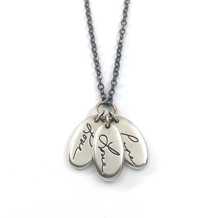 Personalize your necklace with an inspirational word, a name, a tender remembrance, an inside joke, or a sweet sentiment. Create an heirloom by preserving the handwriting of one you love.