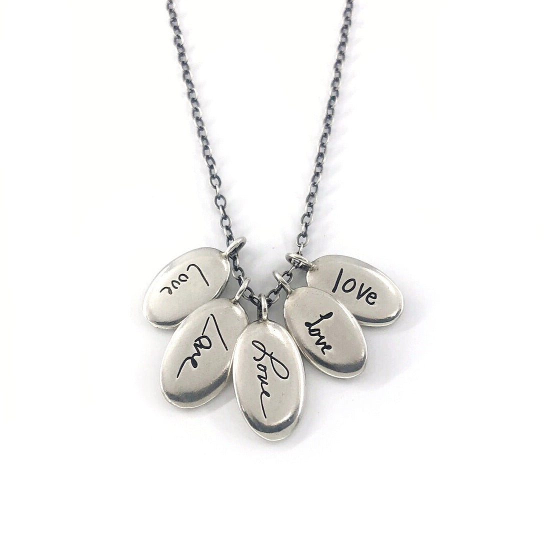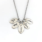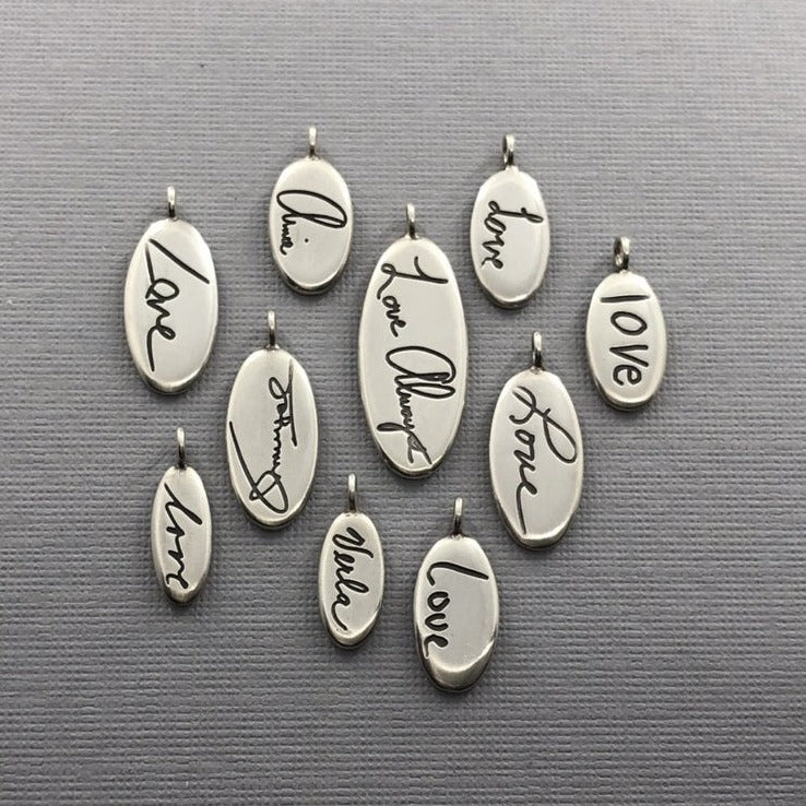 Personalize your necklace with an inspirational word, a name, a tender remembrance, an inside joke, or a sweet sentiment. Create an heirloom by preserving the handwriting of one you love.