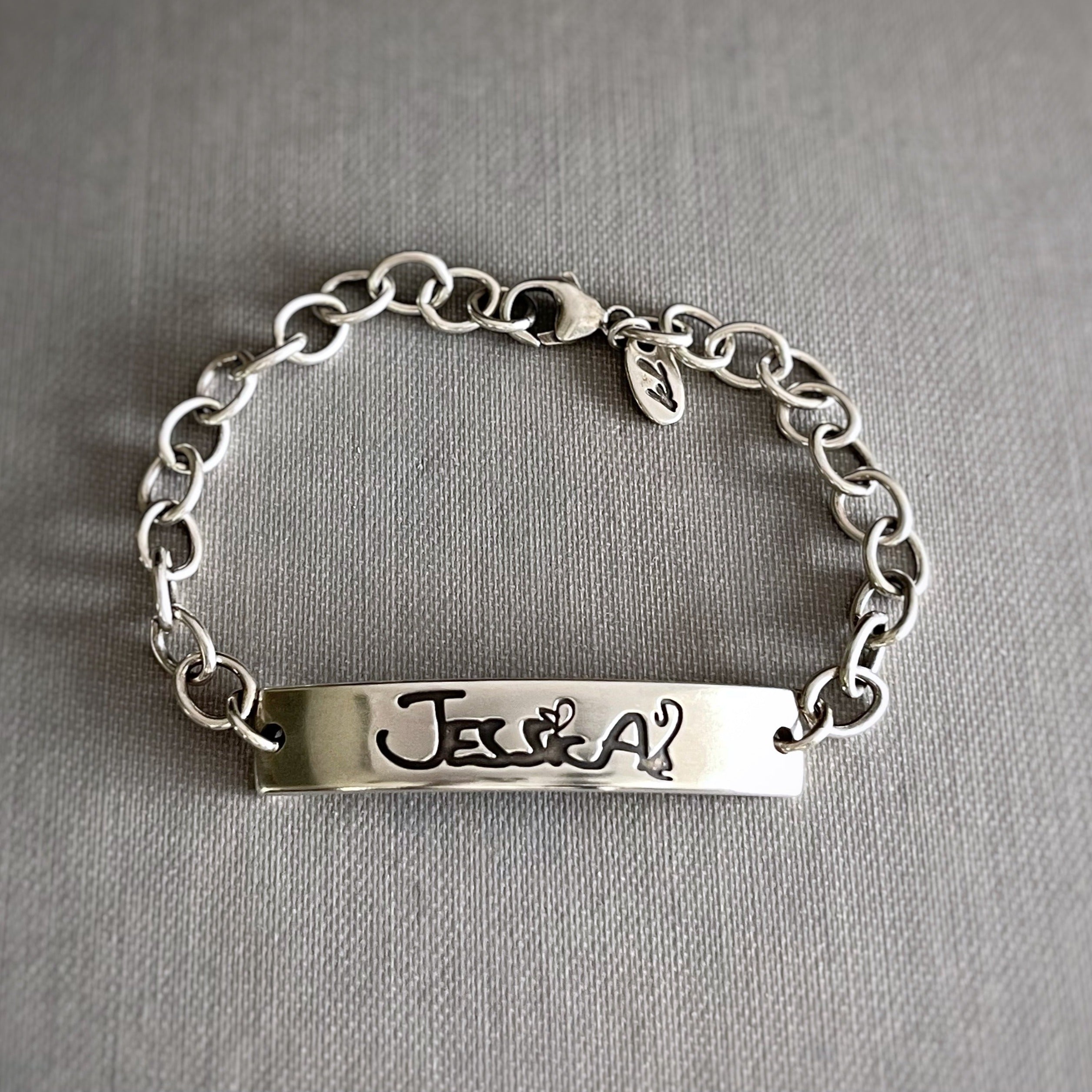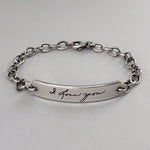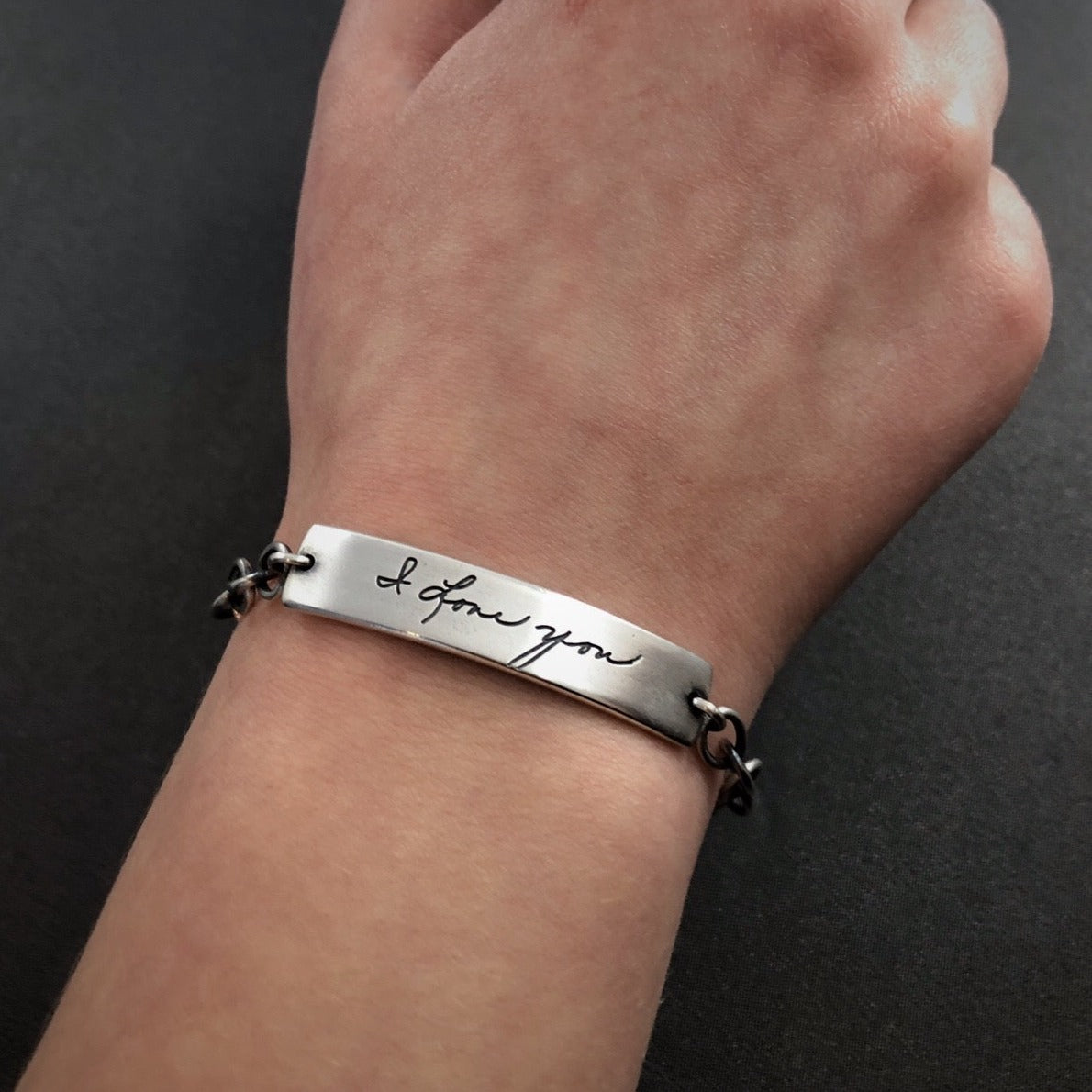 Personalize your bracelet with an inspirational word, a name, a tender remembrance, an inside joke, or a sweet sentiment. Create an heirloom by preserving the handwriting of one you love.