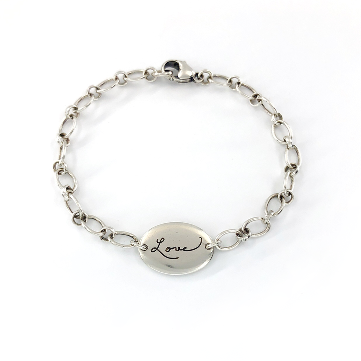 Personalize your bracelet with an inspirational word, a name, a tender remembrance, an inside joke, or a sweet sentiment. Create an heirloom by preserving the handwriting of one you love.
