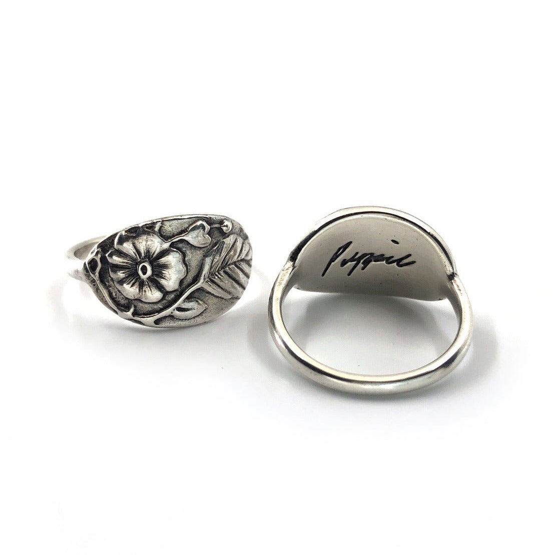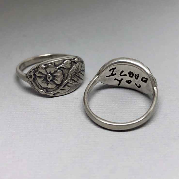 Personalize your ring with an inspirational word, a name, a tender remembrance, an inside joke, or a sweet sentiment. Create an heirloom by preserving the handwriting of one you cherish.