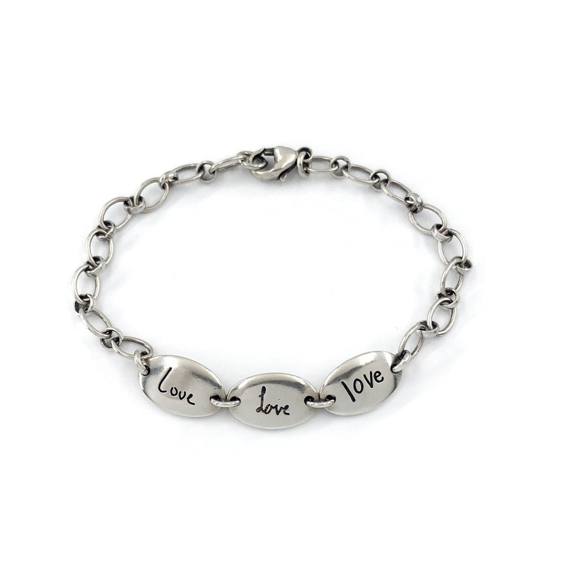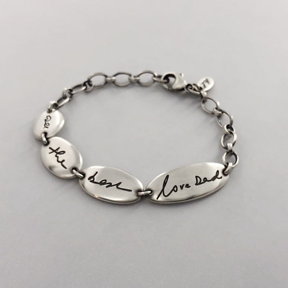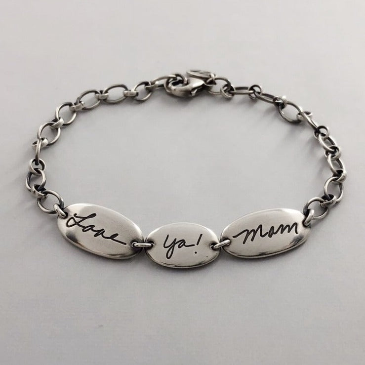 Personalize your bracelet with an inspirational word, a name, a tender remembrance, an inside joke, or a sweet sentiment. Create an heirloom by preserving the handwriting of one you cherish.