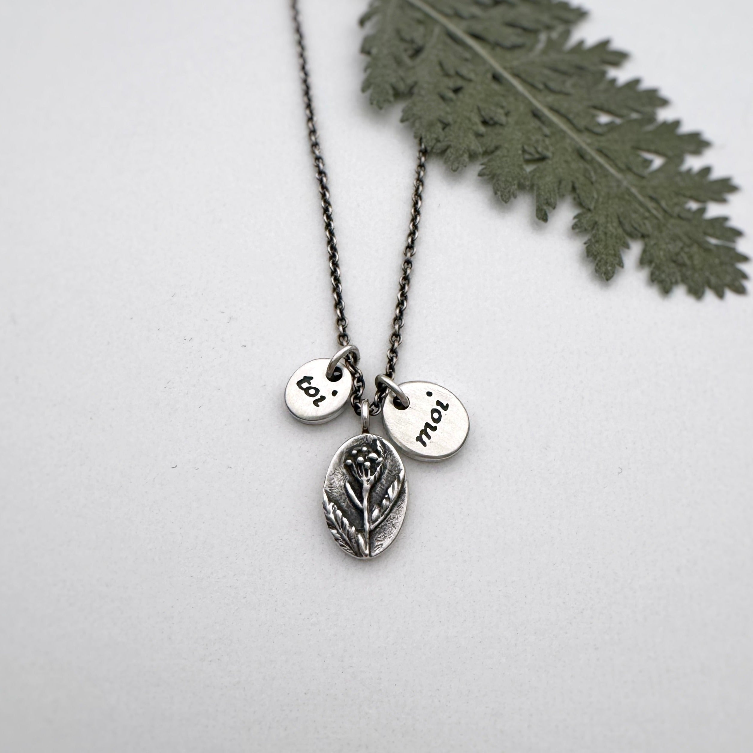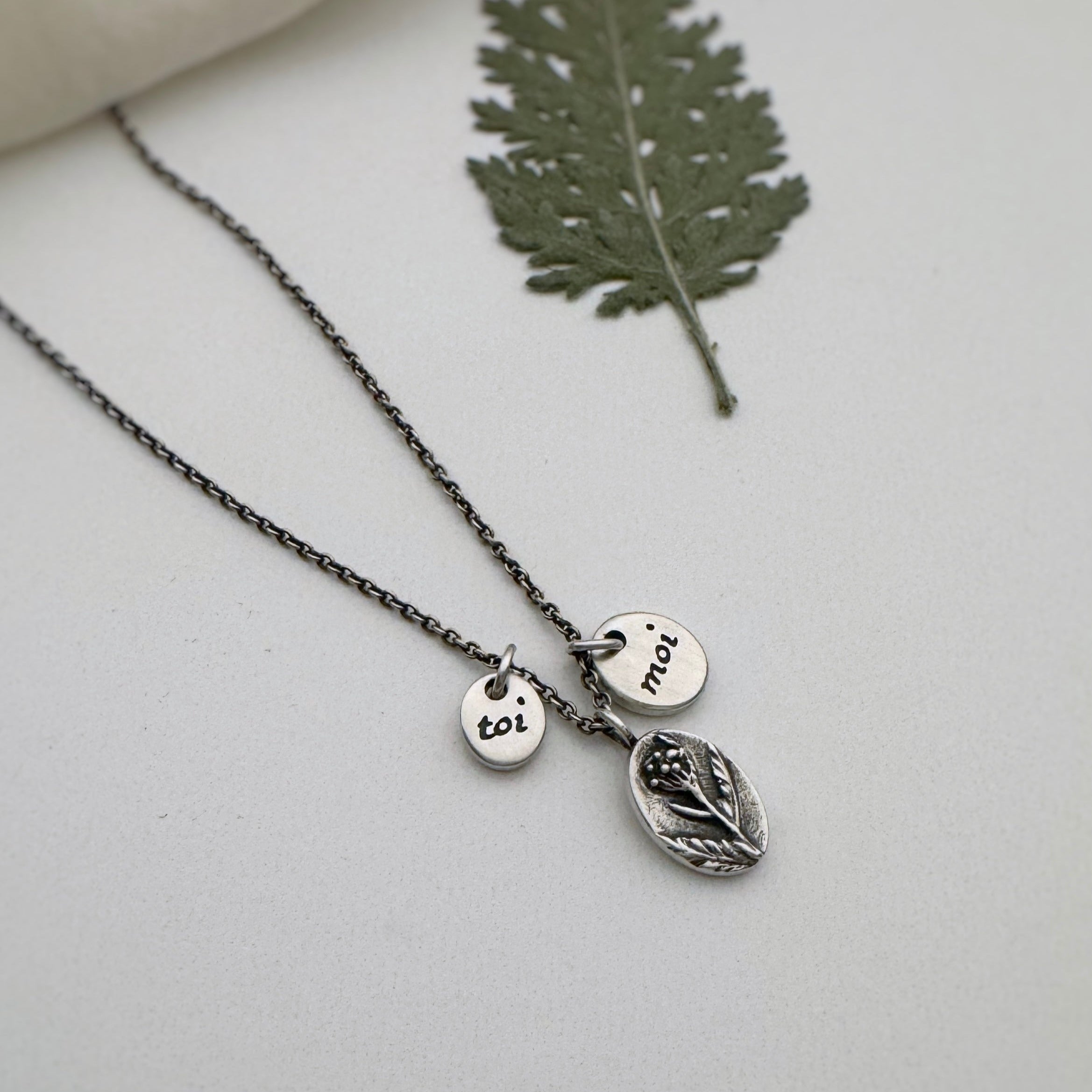 A modern day take on antique Toi et Moi jewelry. A sweet gesture of true love and deep friendship. Two tiny charms inscribed with the words toi and moi in French, meaning you and me.