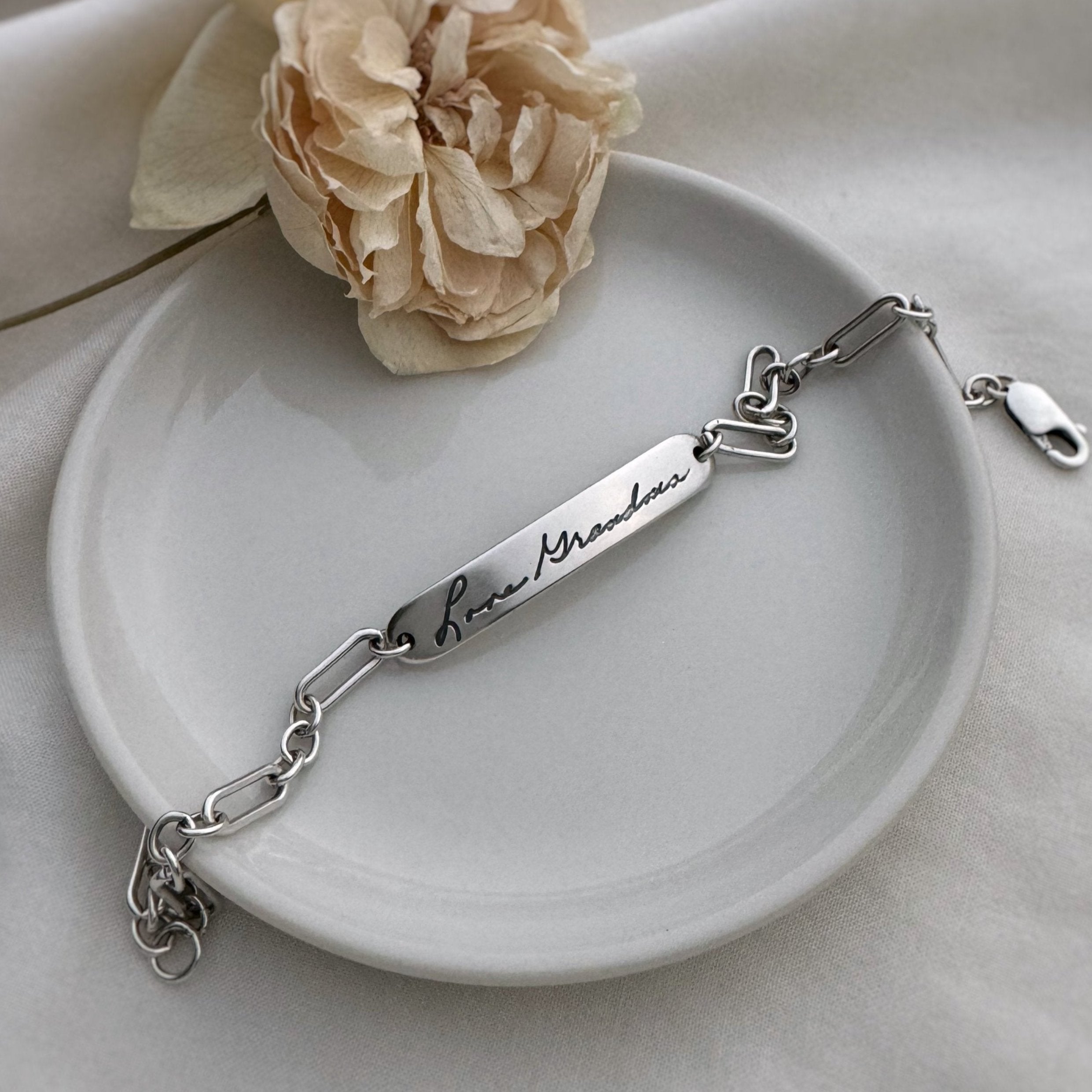 Personalize your bracelet with an inspirational word, a name, a tender remembrance, an inside joke, or a sweet sentiment. Create an heirloom by preserving the handwriting of one you love.